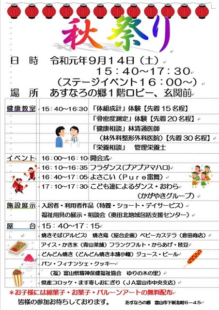 地域の皆様と出演して頂きました皆様、ボランティアの方々にお力添えいただいたおかげで無事に秋祭りを開催することができました。ありがとうございました。
